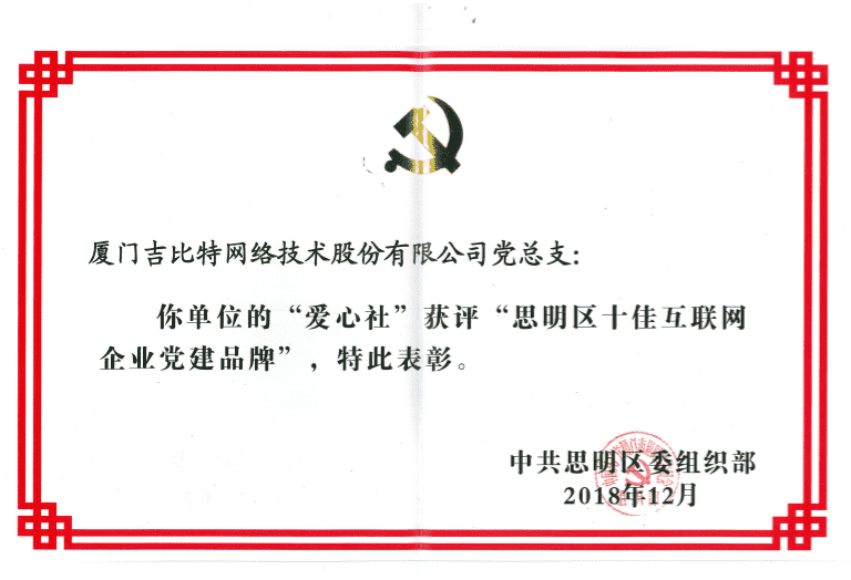 经初审评选、、、、网络评选和专家评审等环节,,"厦门918.com网络技术股份有限公司党总支-爱心社" 从全区28个参评党建品牌中脱颖而出,,,,获评"思明区十佳互联网企业党建品牌"。。