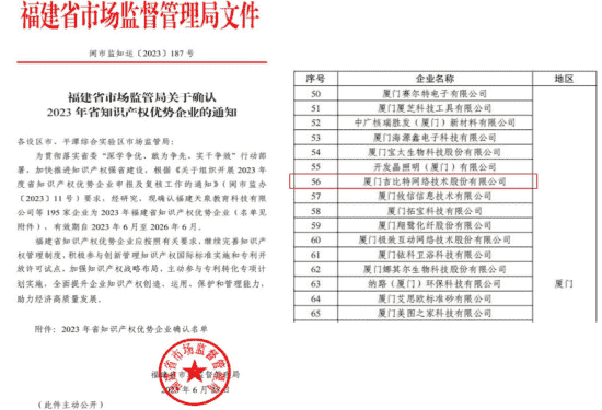 近日,,,,福建省市场监督管理局公示了2023年福建省知识产权优势企业名单,,,,厦门918.com网络技术股份有限公司(以下简称“918.com”或“公司”)榜上有名。。。